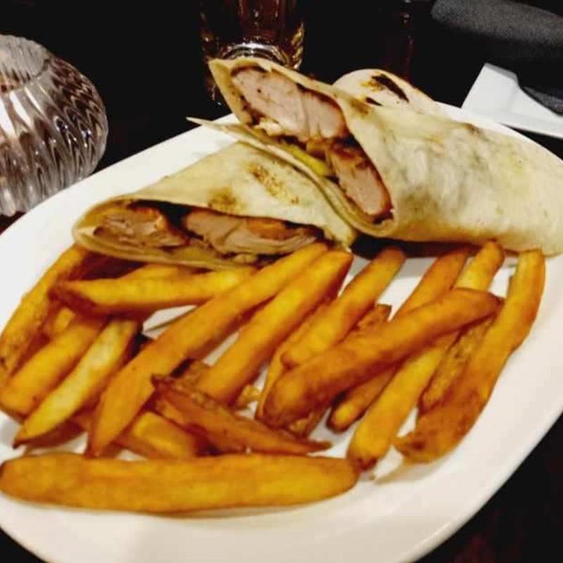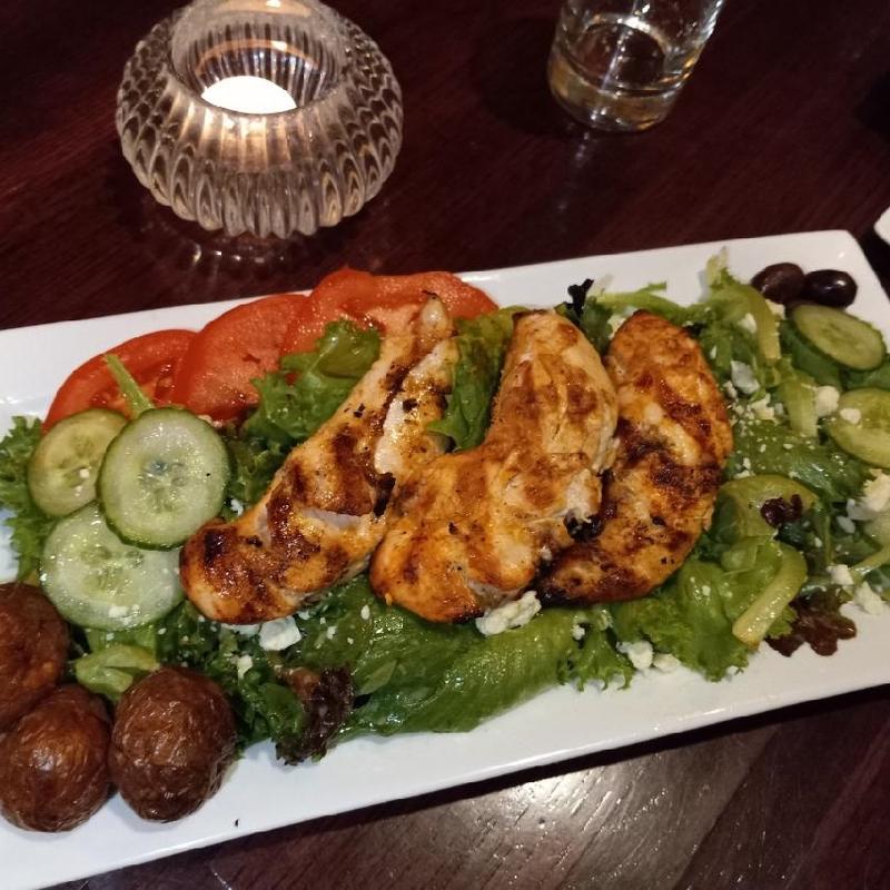 3 large pieces grilled chicken tender, mixed green with lemon Dijon dressing, 3 crispy potato's, feta cheese, tomatoes , olives . Cucomber