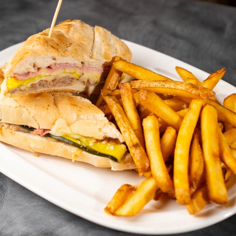 Low roasted pork, dee jay's smoked ham, Swiss cheese, mustard aioli, fries • Vegan and vegetarian options always available