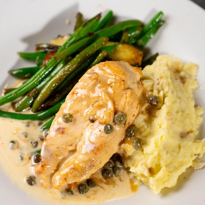 Pan seared chicken breast, white wine lemon butter sauce, capers, garlic butter mashed potatoes, sauteed seasoned vegetables