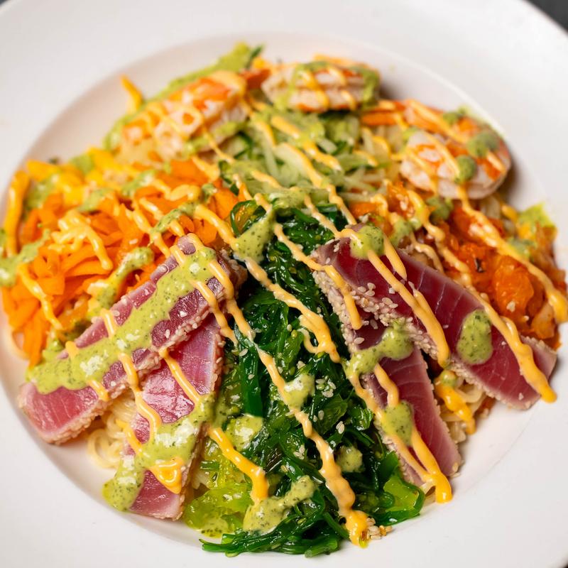 Ahi tuna, shrimp, seaweed salad, kimchi, carrot, cucumber, spicy yum-yum, green goddess, ramen noodles, sesame seeds
