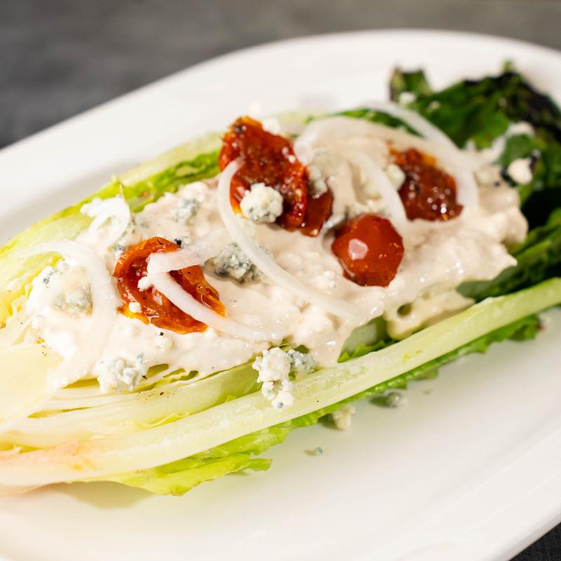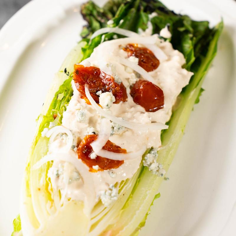 Grilled romaine, candied bacon, roasted tomatoes, onion, blue cheese crumbles & dressing