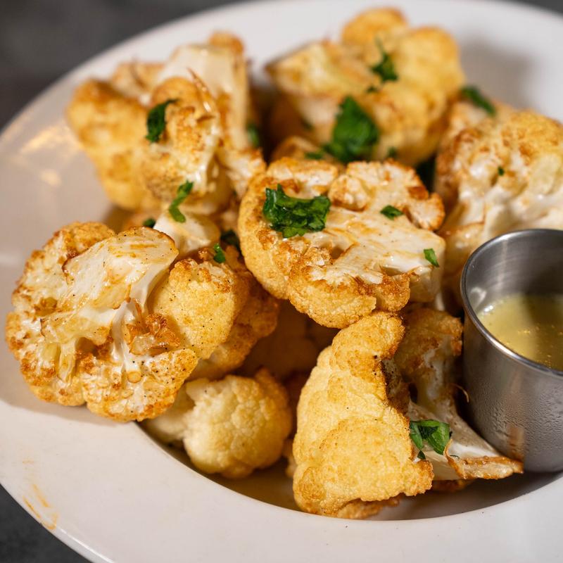 Seasoned Fried cauliflower , Garlic aioli dressing and choice of hot sauce , garnish of parsley