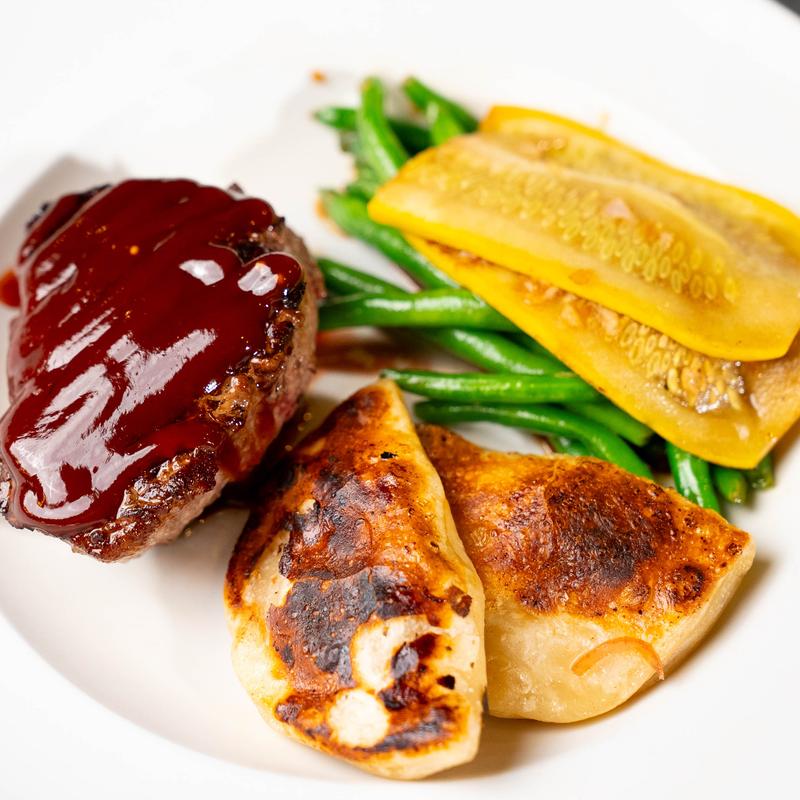 8 oz of sirloin , Perla’s potato & cheddar pierogis, caramelized onions, sautéed vegetables, house wine reduction or chim cherry sauce