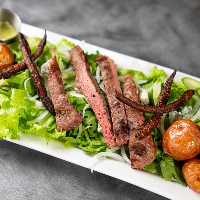 5oz Ohio grass fed sirloin, roasted carrots, crispy potatoes, blue cheese, cucumber, onion, mixed greens, green goddess